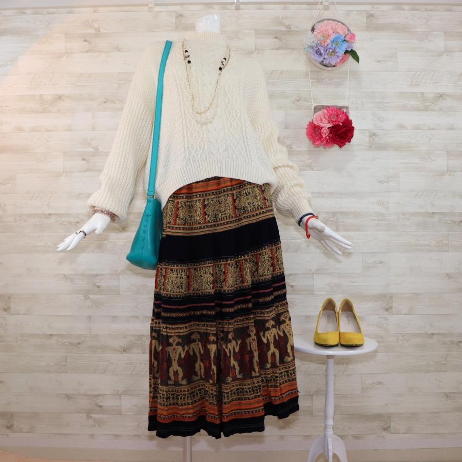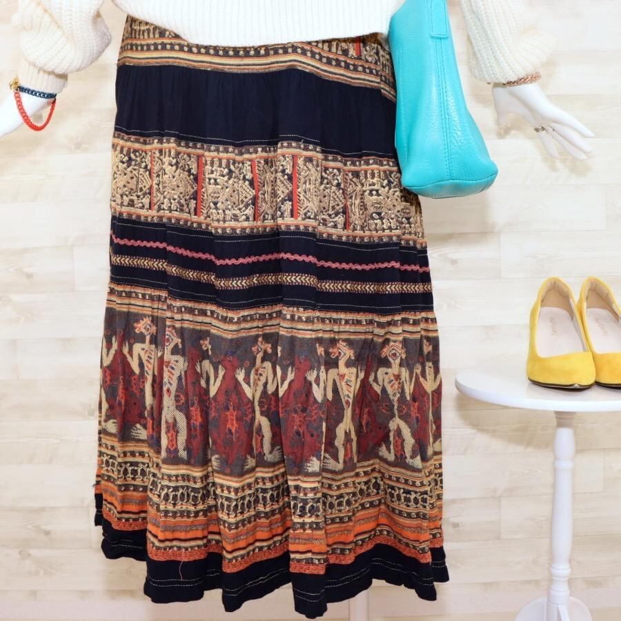 エスニックテイストで鮮やかなスカートなのでこれ1着で主役級ファッションが出来上がります。