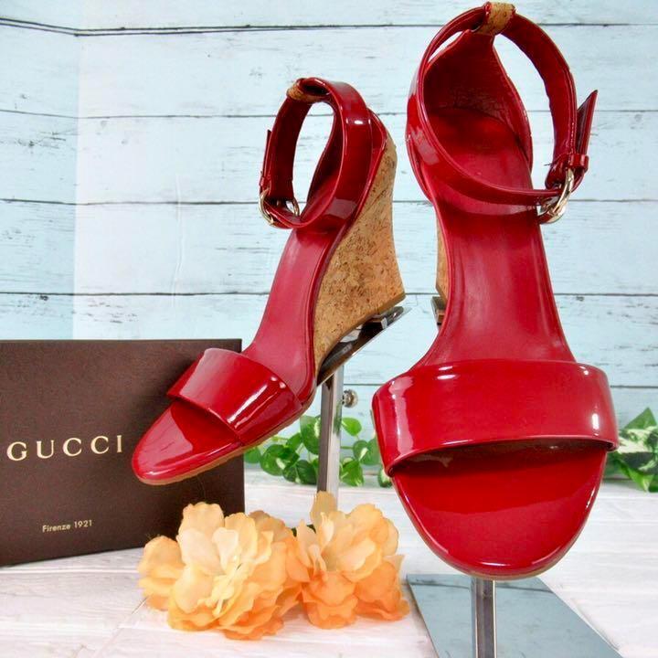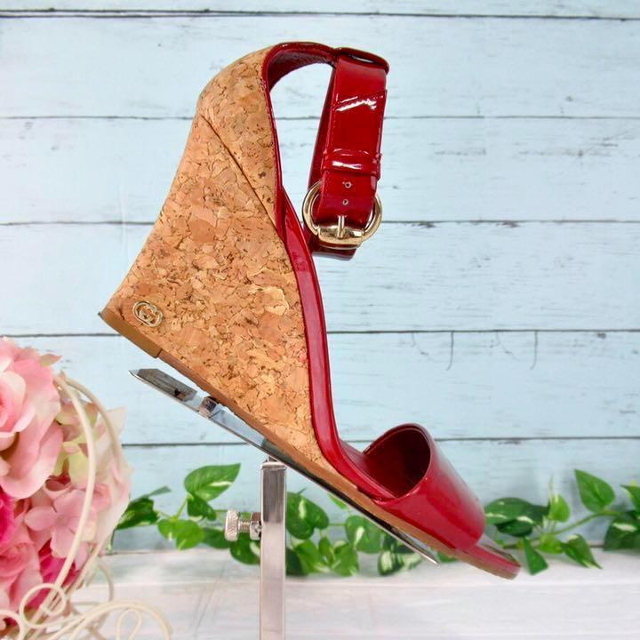 GUCCI エナメル素材切替 オープントゥサンダル ウェッジソール 赤 大きめ