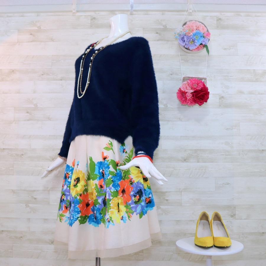 ひざ丈スカートなので、ショートブーツや少し裾と被るくらいのロングブーツと合わせても可愛いので、秋コーデや冬コーデにもぴったりです。