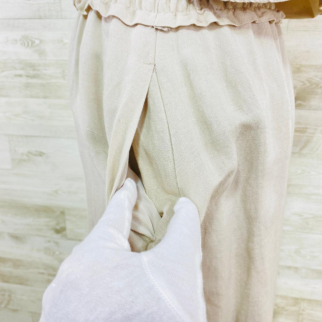夏から秋にかけてピッタリのリネンの混紡素材なので、涼しく着てもらえるかと思います。ウエストがゴムになっているので、女性らしいくびれたシルエットを作ることができるので、可愛く着ることができますよ♪