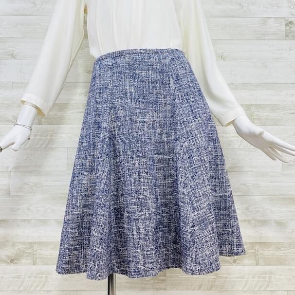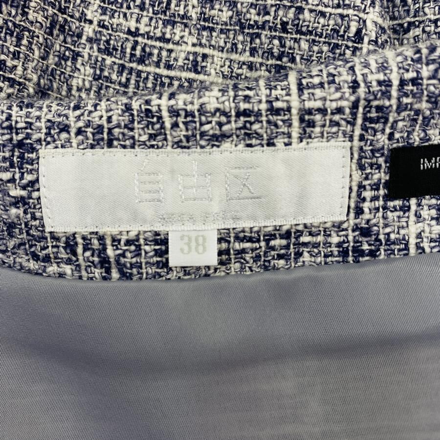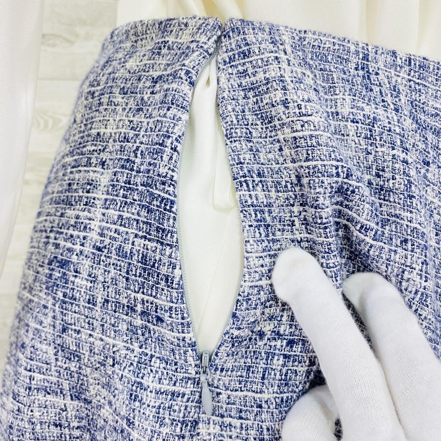 自由区 ひざ丈ツイードスカート M 白×ブルー オフィスカジュアル ほぼ未使用