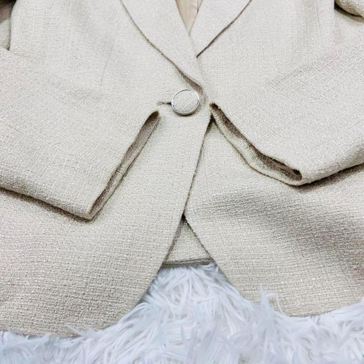 ツイード素材でトップスはテーラードジャケット型なので、仕事の会食や、ちょっと形式ばった場に着ていくのにも丁度良いです。