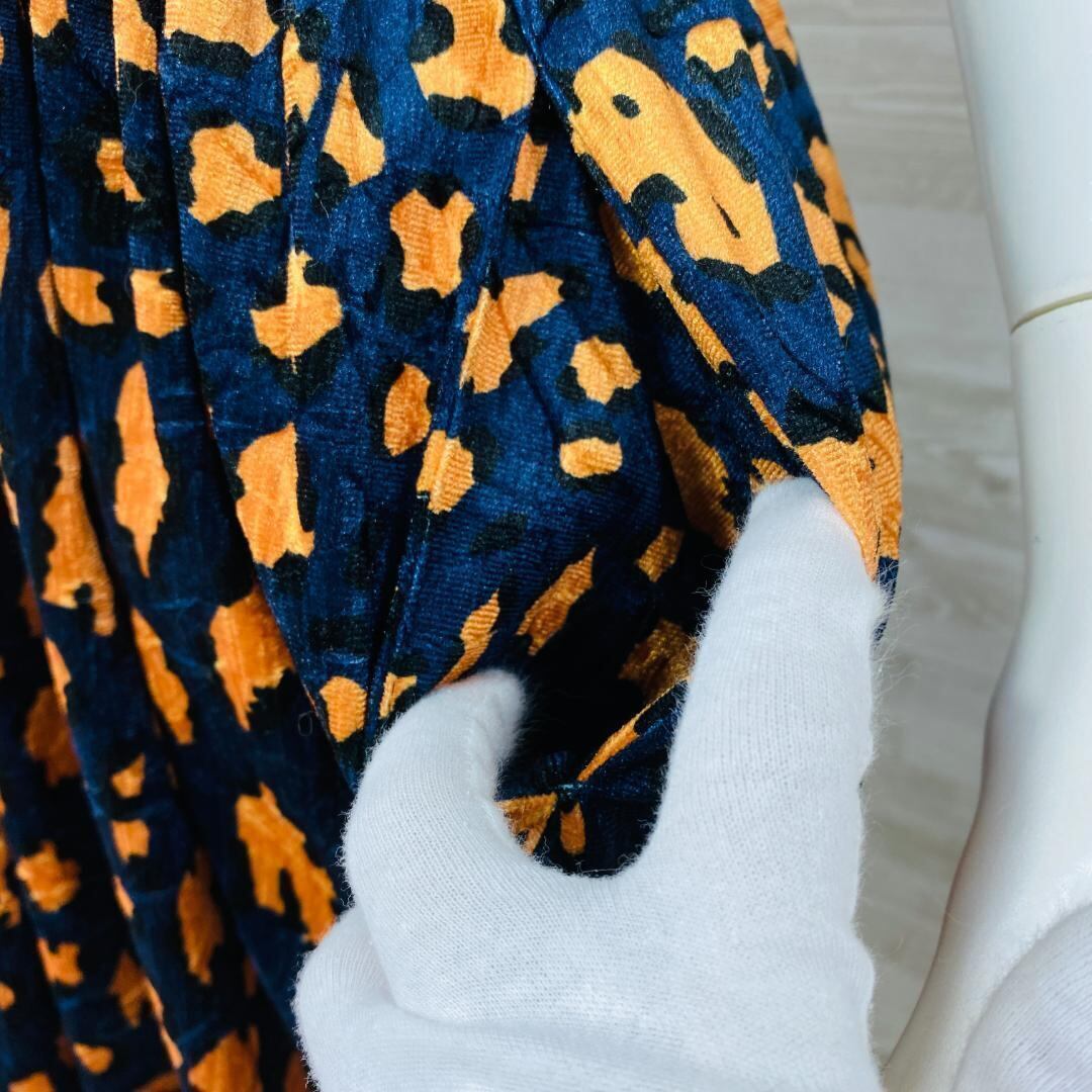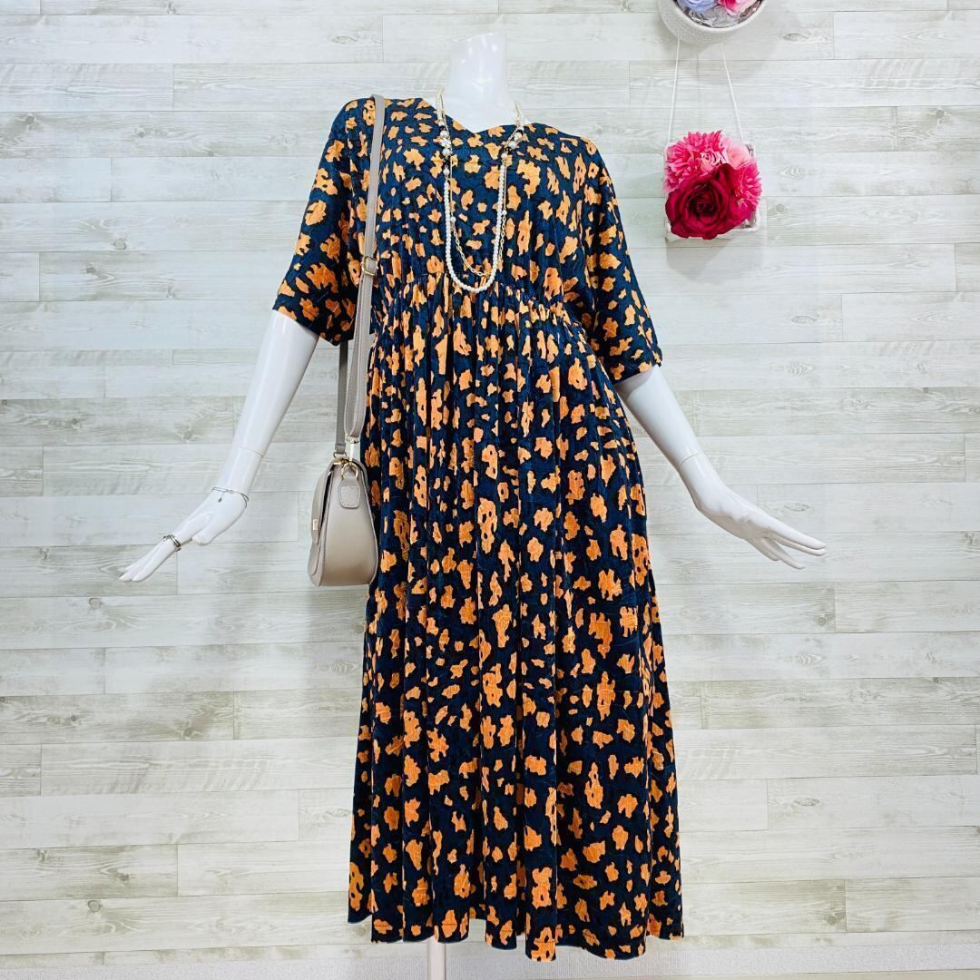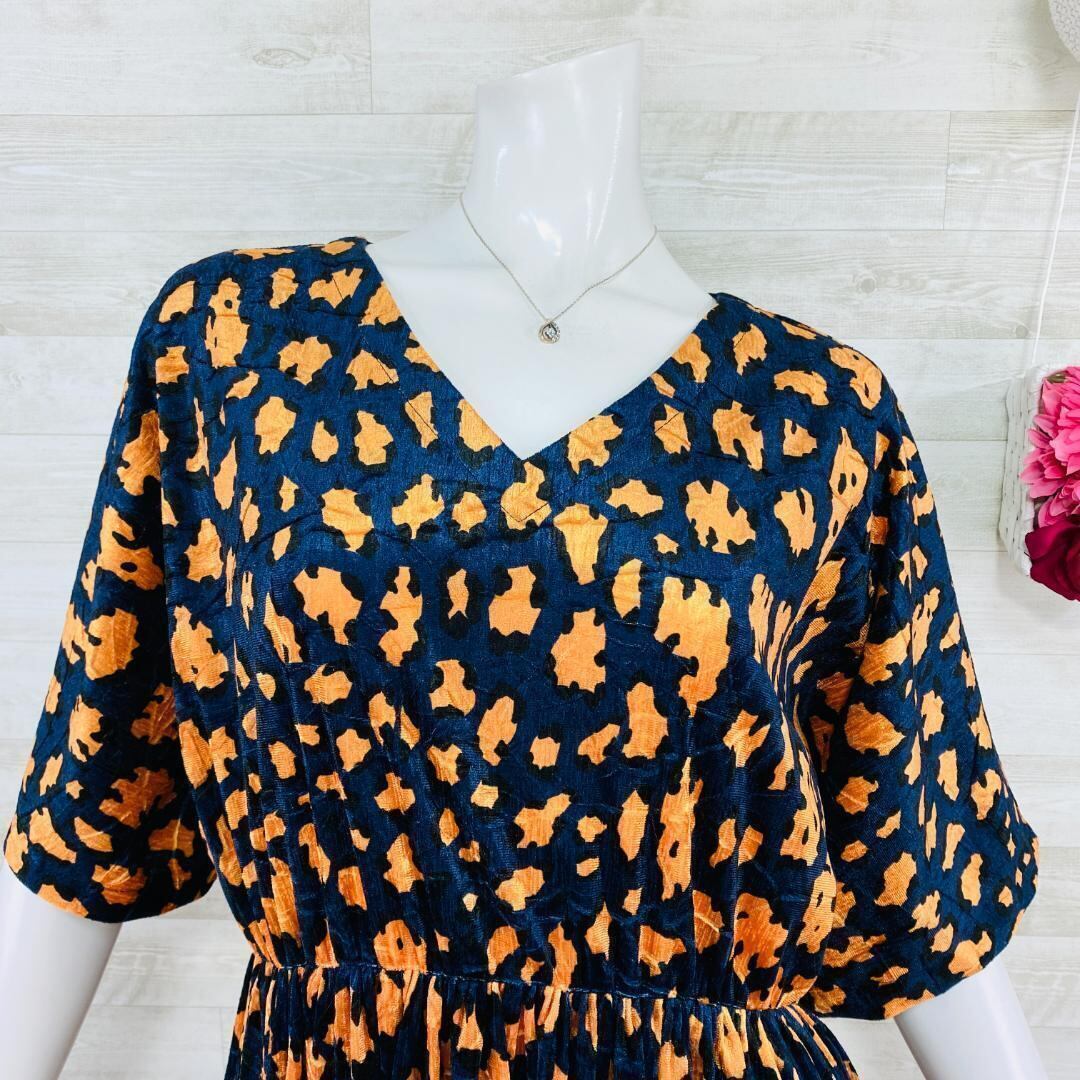 プニュズ ベロア調Vネックロングワンピース 3L 総柄 紺×橙 大きいサイズ