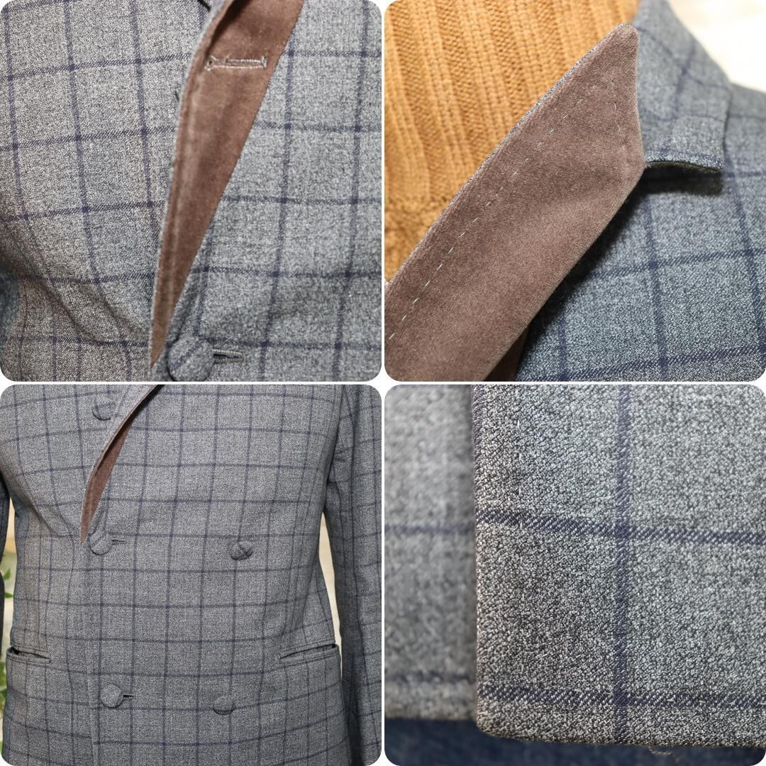 ピークドラペルで高級感を感じる仕上がりで、さらにラペル裏は茶色の折り返しスエード地があしらわれており、さりげなくチラ見えするのがお洒落ポイント高いと思います。