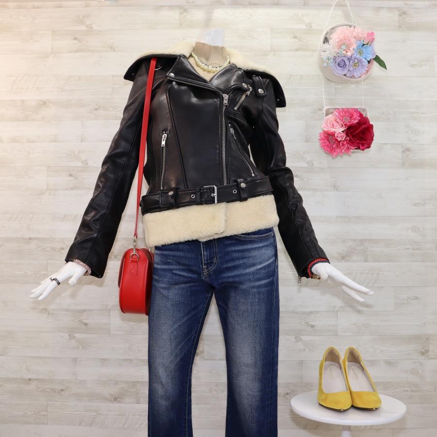 ブラックのレザージャケットなのでかっこよさもありますし、ホワイトのボアが可愛い印象もプラスしてくれています。