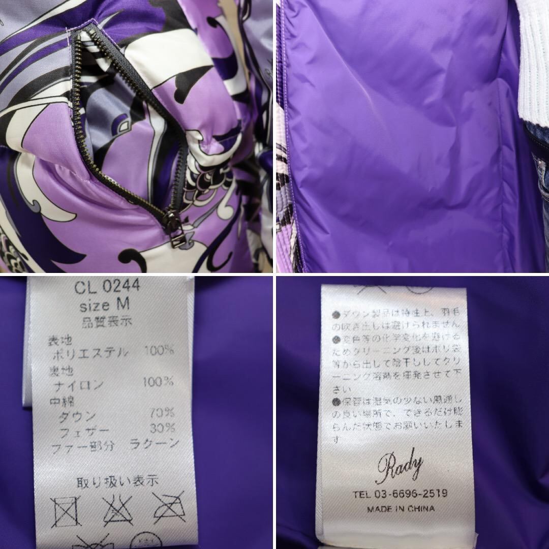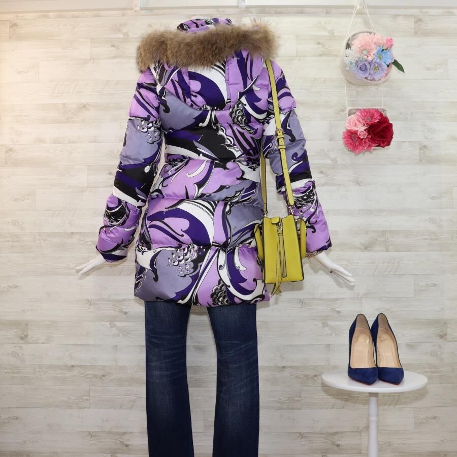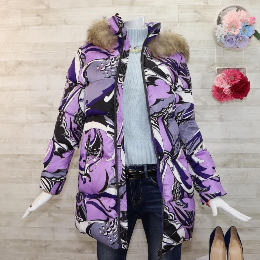 レディ ダウンジャケット M パープル マーブル柄 ファー フード付 ほぼ未使用