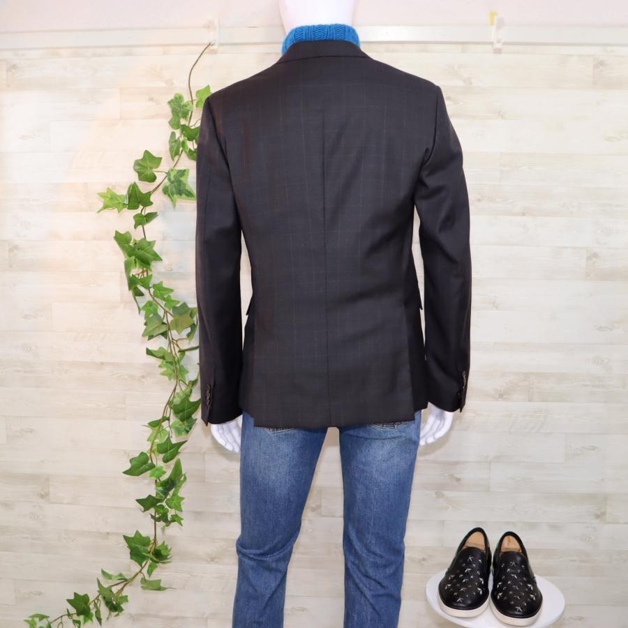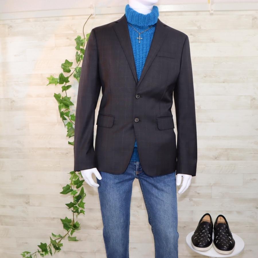 色は暗い灰色で、生地が薄くチェック模様になっています。サイズは48なので、メンズのL相当です。
