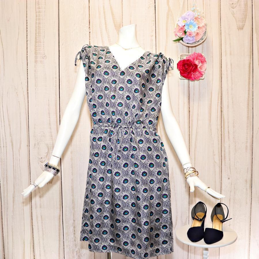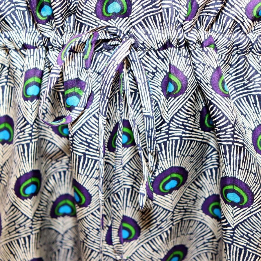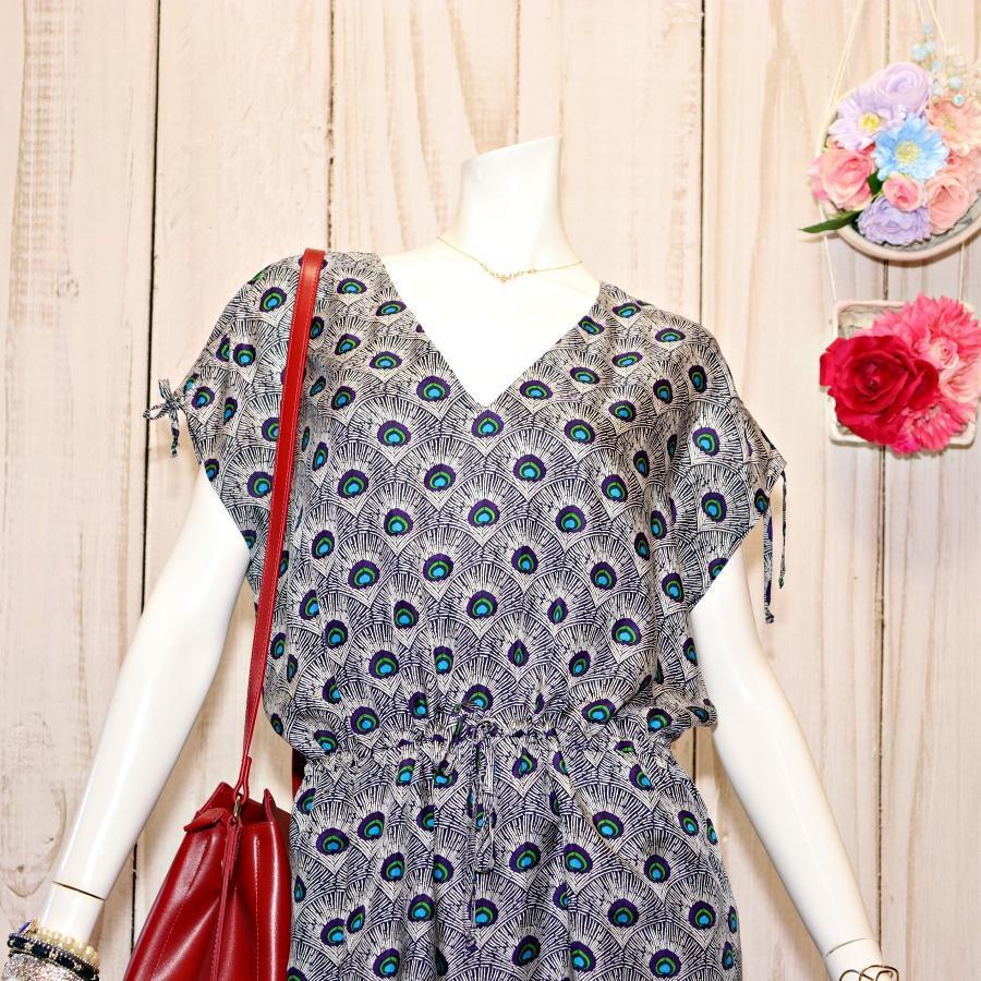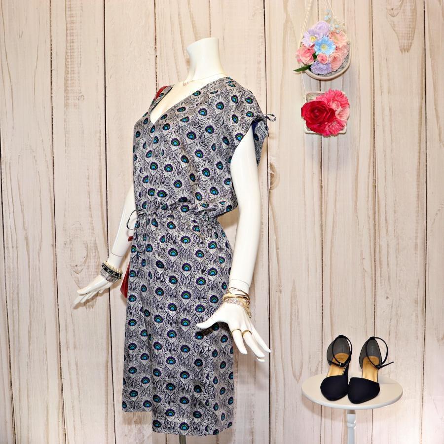 トリーバーチ フレンチスリーブ 孔雀柄ワンピース M シルク ミモレ丈ほぼ未使用