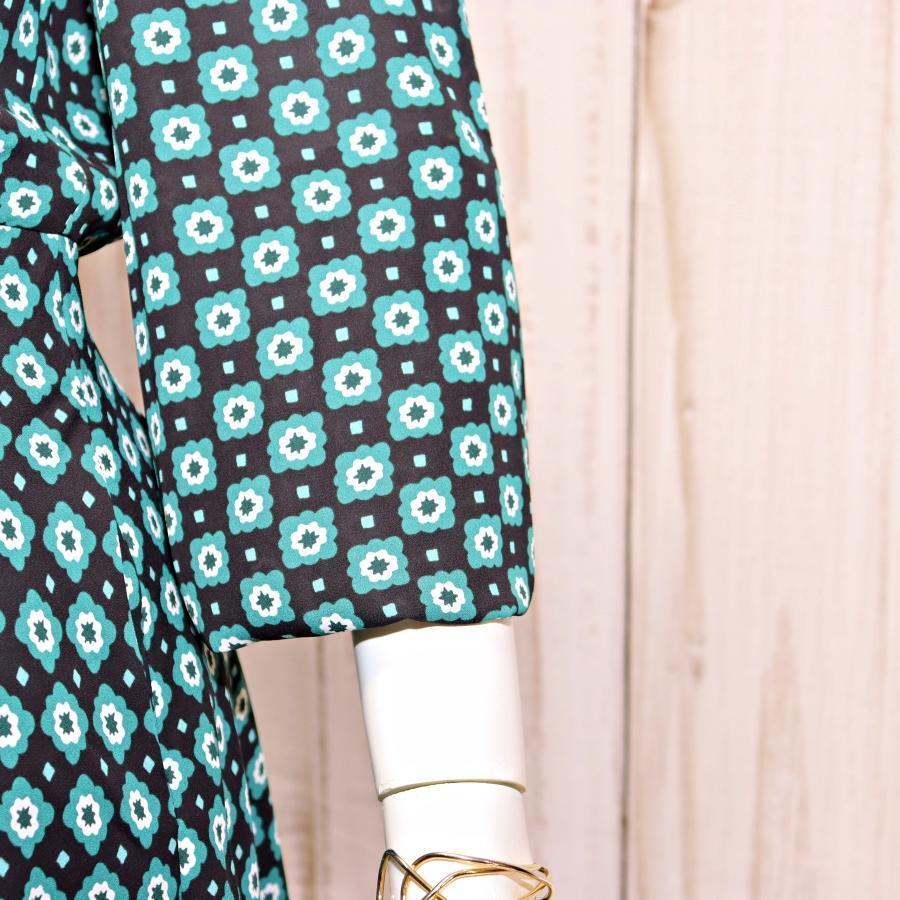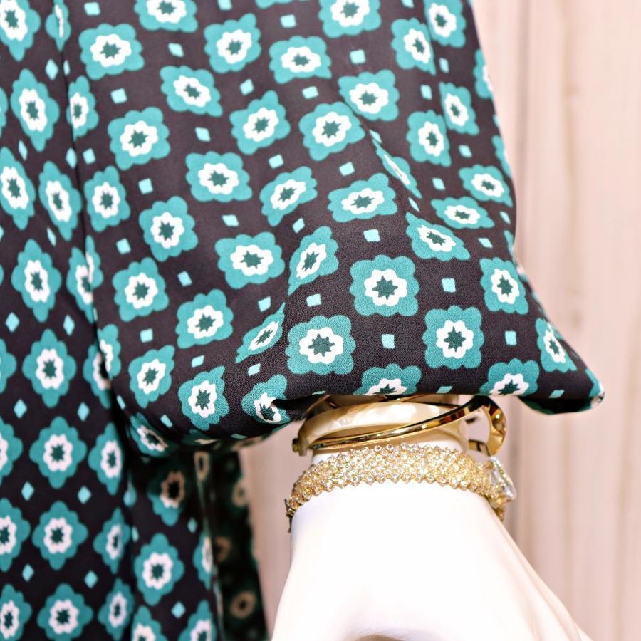 特徴:Aライン、派手ワンピース、清楚系ワンピース、総柄、ペザントスリーブ、深Vネック、襟リボン