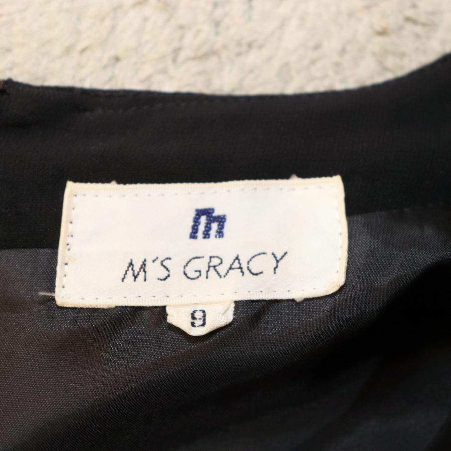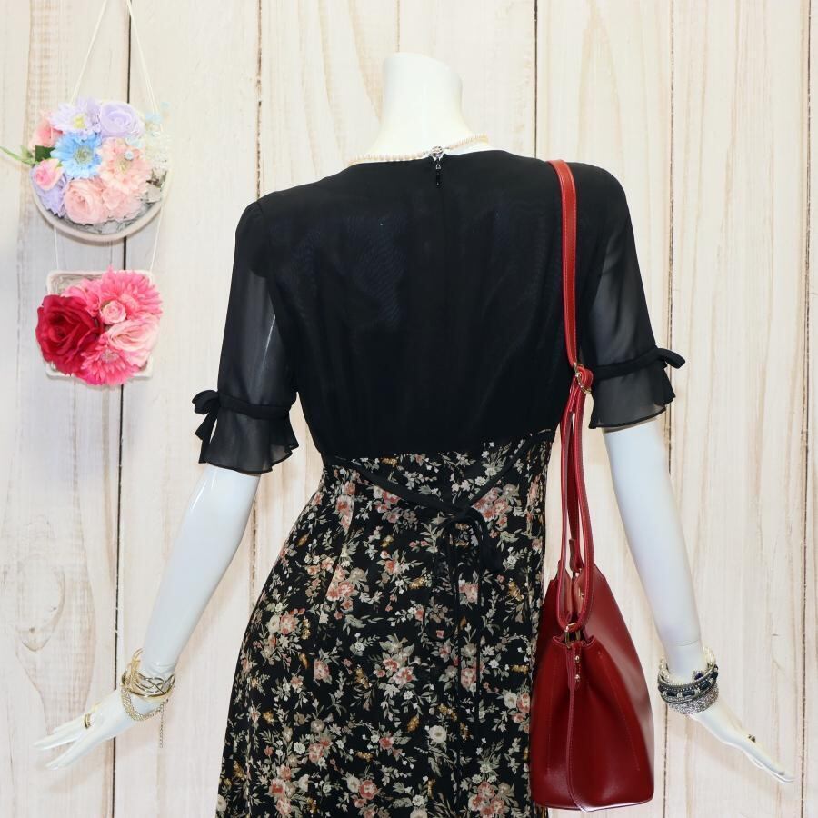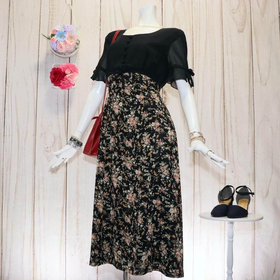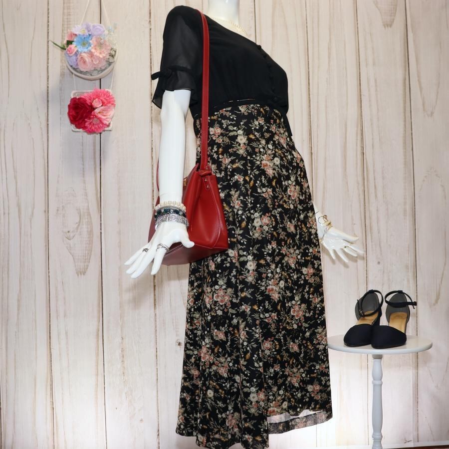 M's Gracy ベルテッドシアーワンピース M ロング丈 黒×花柄