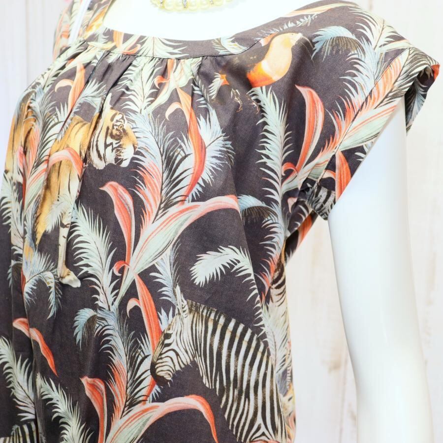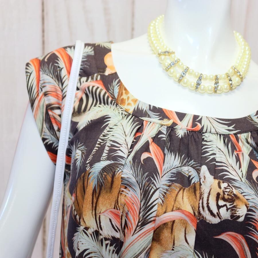インパクト大のトラやシマウマ、キリンなどがプリントされているワンピースです。