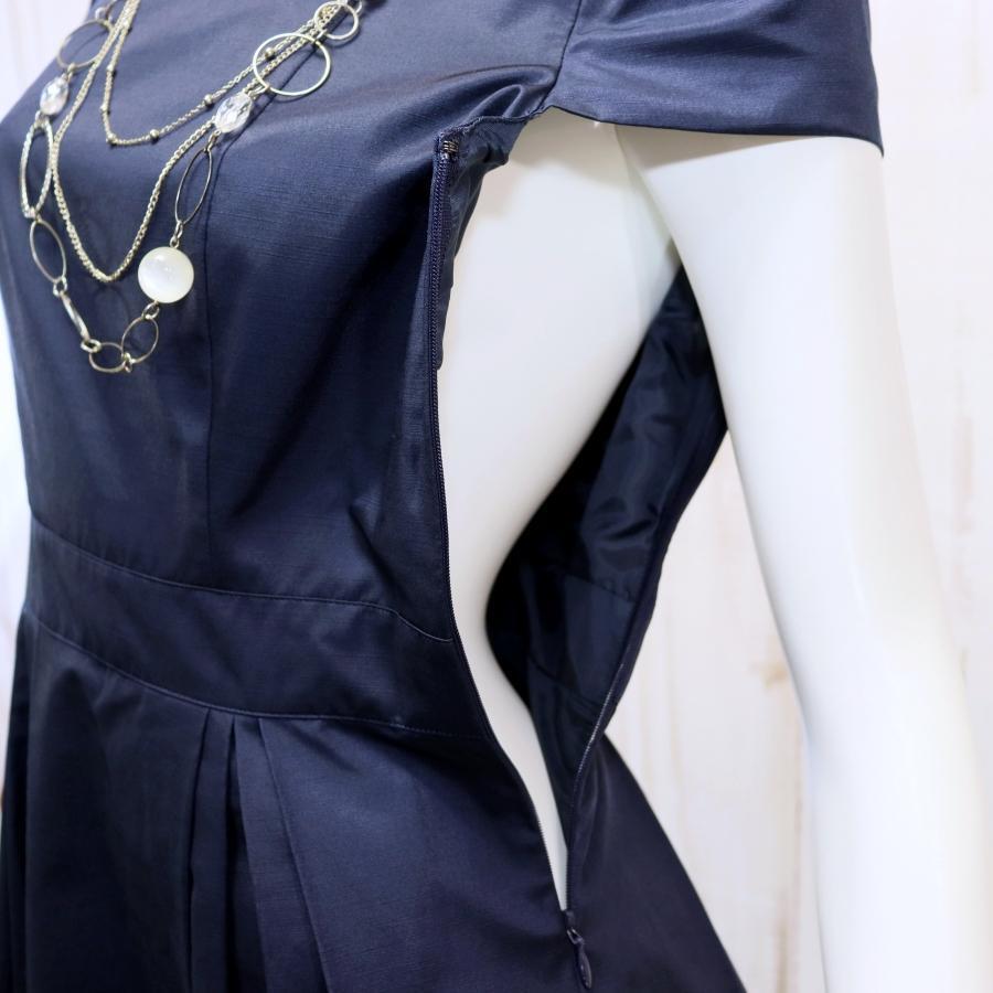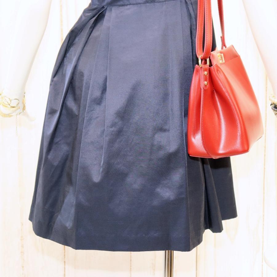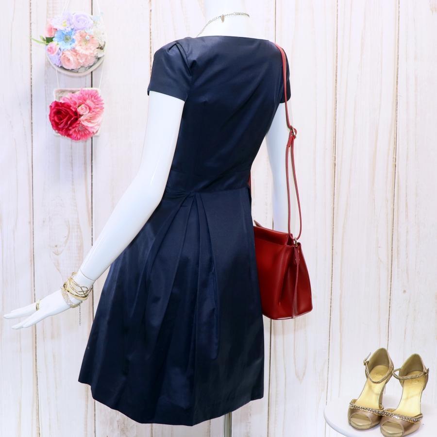 ANAYI ひざ丈ワンピース S 半袖 ネイビー フレア サテン タックスカート