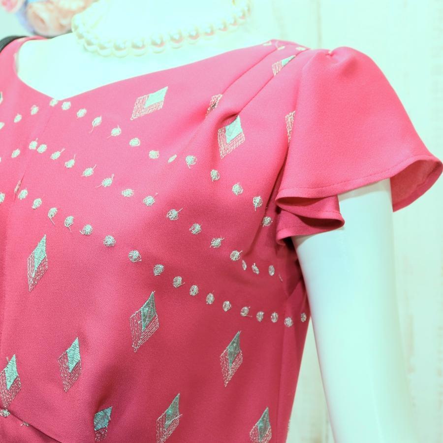 特徴:Aライン、フレア、派手ワンピース、清楚系ワンピース、サーキュラーカットスリーブ、ダイヤ柄、ハートシェイプトネックライン